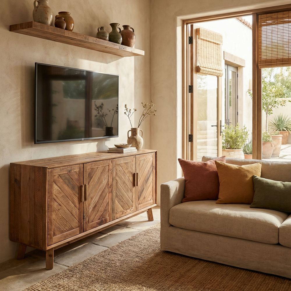 Aparador estilo buffet em madeira de pinho reciclada com 4 portas em forma de espinha.