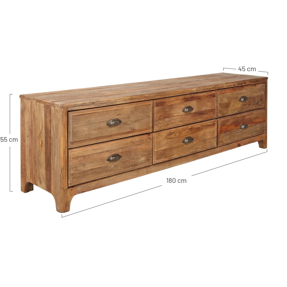 Fabricado em madeira de pinho reciclada com 6 gavetas.