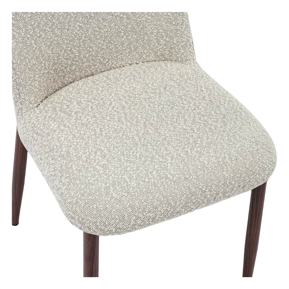 O acabamento em imitação de madeira suaviza a presença do metal, conseguindo uma combinação equilibrada entre o industrial e o natural. Este contraste torna a cadeira um elemento versátil, ideal para interiores que procuram modernidade sem sacrificar o calor. O assento e o encosto são estofados em tecido, oferecendo um conforto superior e uma experiência agradável tanto para o uso quotidiano como para ocasiões especiais.