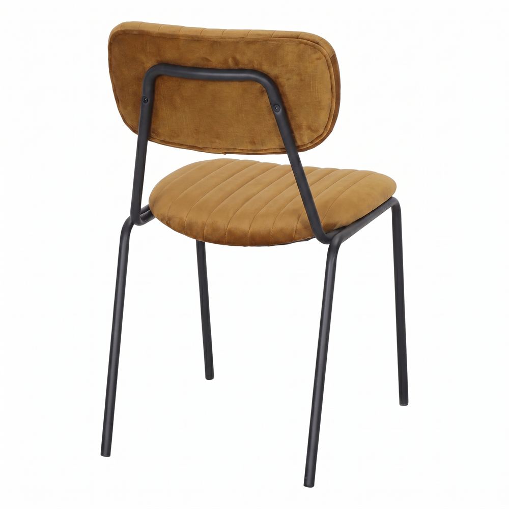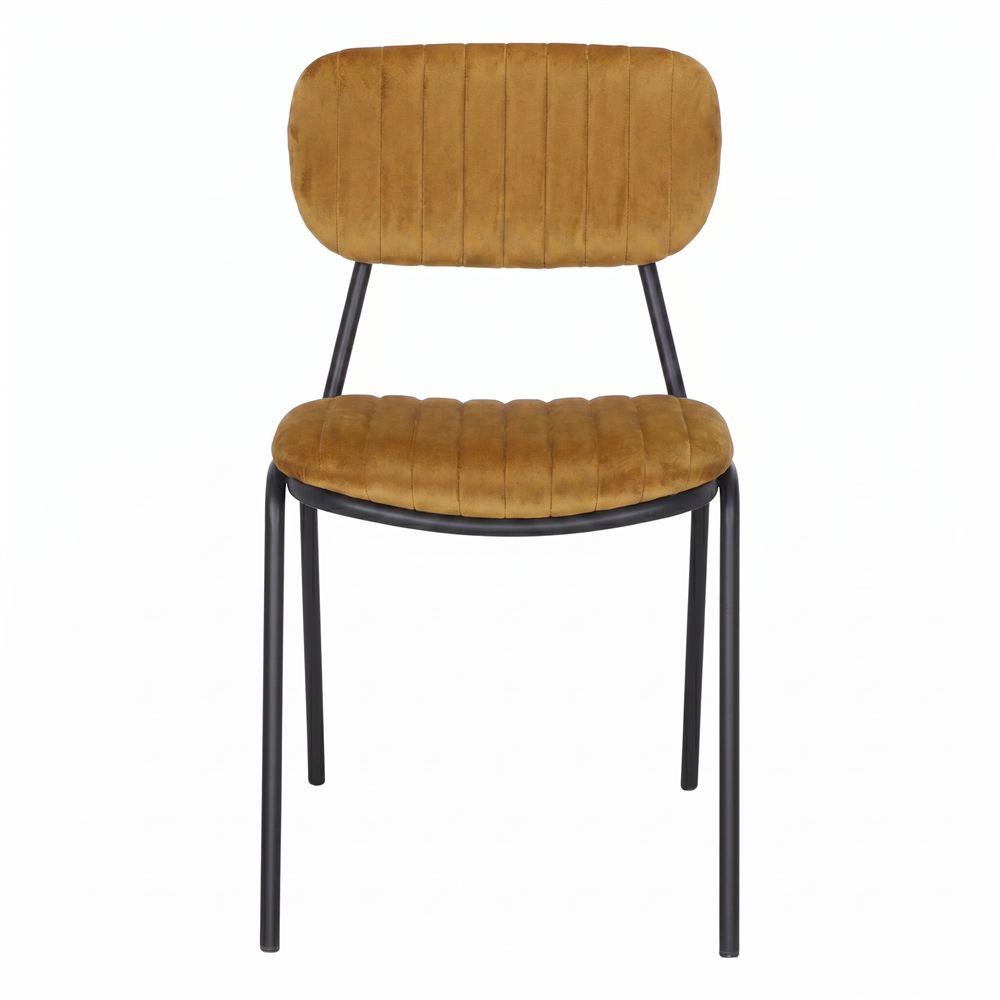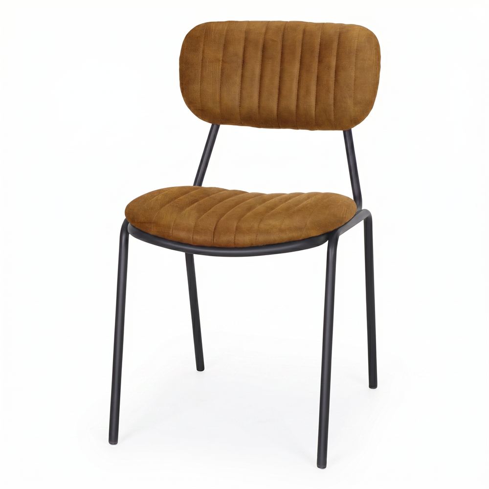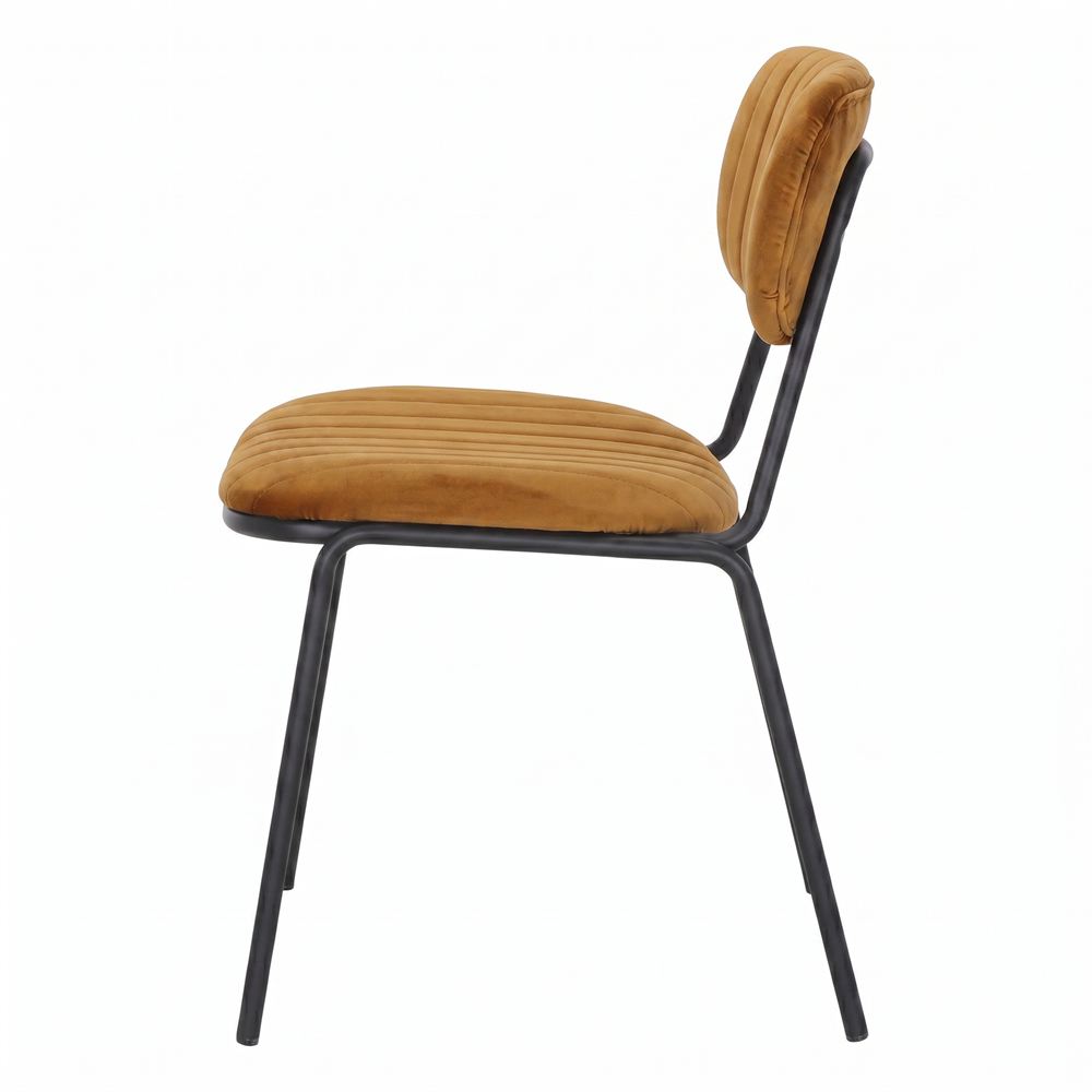 O verdadeiro coração desta peça reside no seu assento e encosto, estofados com um tecido de alta qualidade na cor curry. Este tom vibrante e picante não só confere uma dose necessária de energia visual ao espaço, como a sua textura suave convida a desfrutar de longas refeições à mesa. O contraste cromático entre a dureza do aço escuro e a vitalidade do tecido cor de caril cria um equilíbrio visual fascinante, ideal para casas com personalidade, cafés de design ou estúdios criativos que fogem do convencional. Ao escolher a Cadeira Nevelia, aposta-se numa ergonomia cuidada, onde a resistência do ferro se funde com a máxima elegância.