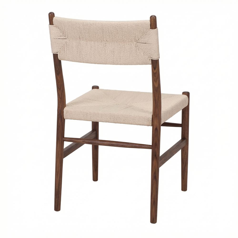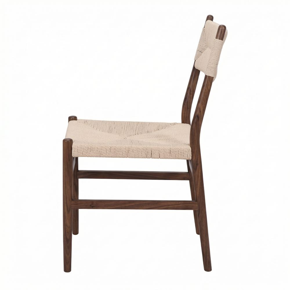 A estrutura desta cadeira é inteiramente fabricada em madeira maciça de olmo. O olmo é apreciado pela sua resistência e pelo seu veio característico, que neste modelo é realçado por um sofisticado acabamento em tom de nogueira. Este tom escuro e profundo confere uma elegância intemporal, permitindo que a cadeira se destaque tanto em salas de jantar rústicas como em ambientes modernos que procuram um toque de contraste orgânico.