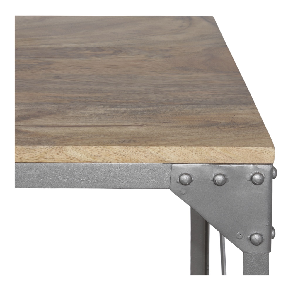 Estrutura em aço com rodas, com acabamento envelhecido.