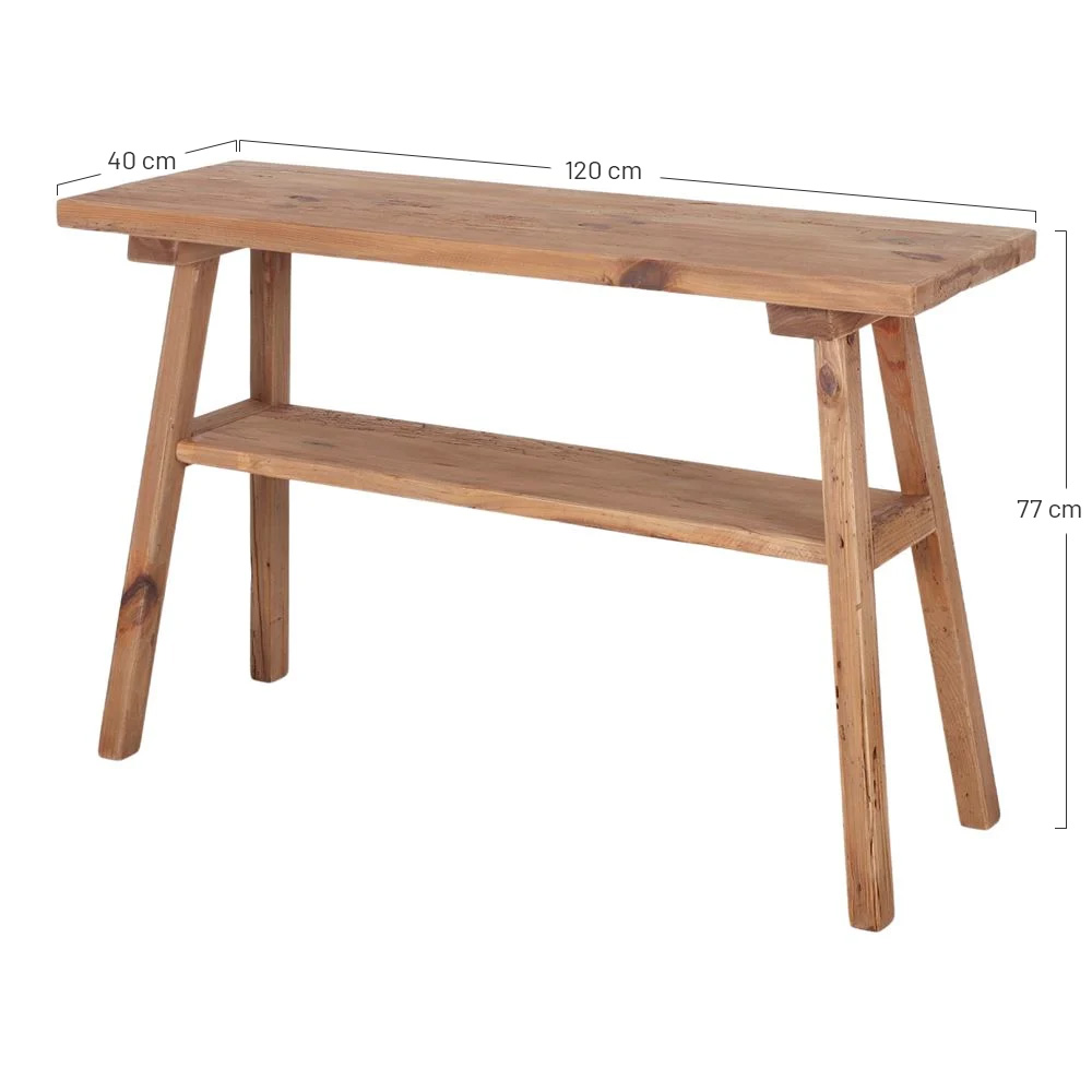 Mesa de consola retangular em madeira maciça de pinho reciclada com prateleira inferior.
