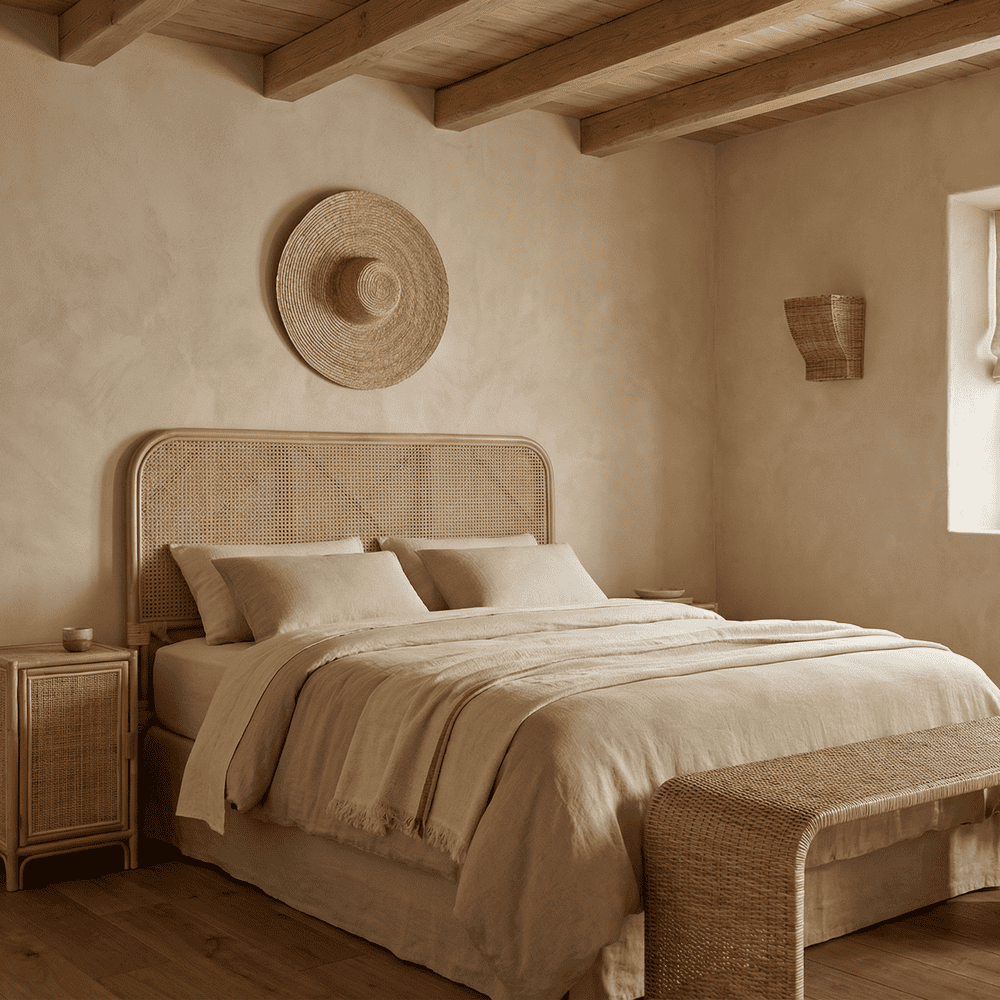 Mesa de cabeceira Ravenna em rattan, de estilo Japandi.
