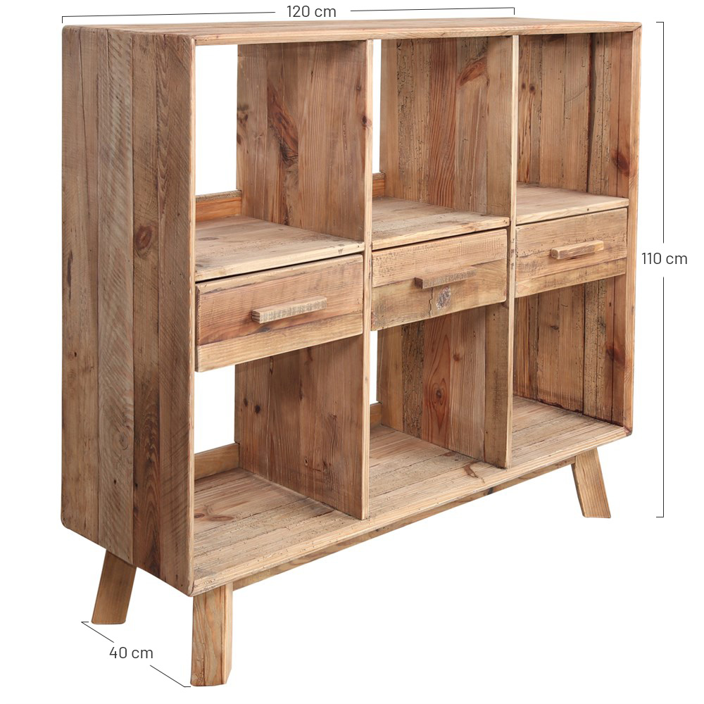 Fabricada em madeira maciça de pinho reciclado com 3 gavetas e 6 compartimentos.