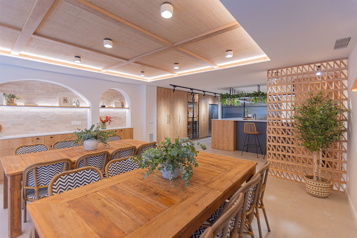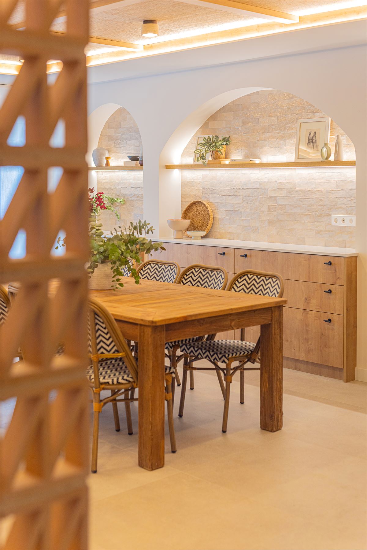O resultado é uma casa concebida para ser desfrutada: uma grande cozinha em plano aberto funde-se com a sala de estar principal, articulada em torno de um bar central que marca o ritmo do espaço. À sua volta, os materiais naturais e os tons quentes criam um ambiente descontraído, onde a madeira e o rotim acrescentam textura e carácter.