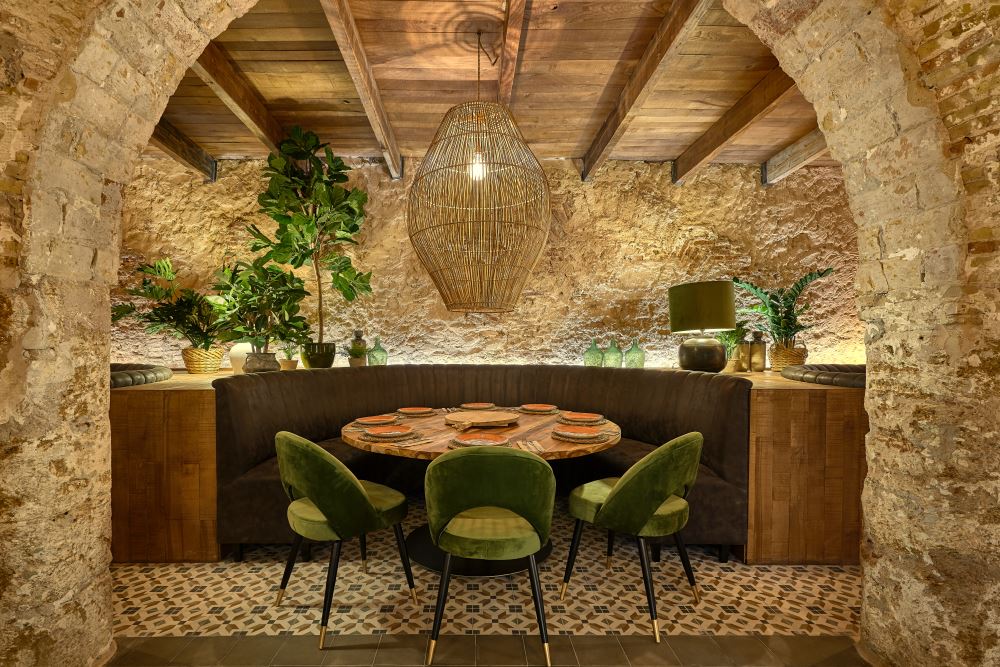 Candeeiros de estilo nórdico, cadeiras estofadas e mesas de madeira de teca ou cadeirões de rotim natural completam a decoração interior, tornando o restaurante num espaço acolhedor e caloroso. A arquitetura do local, com os seus arcos antigos e a pedra de ostra de Cádis, proporcionam um ambiente único.