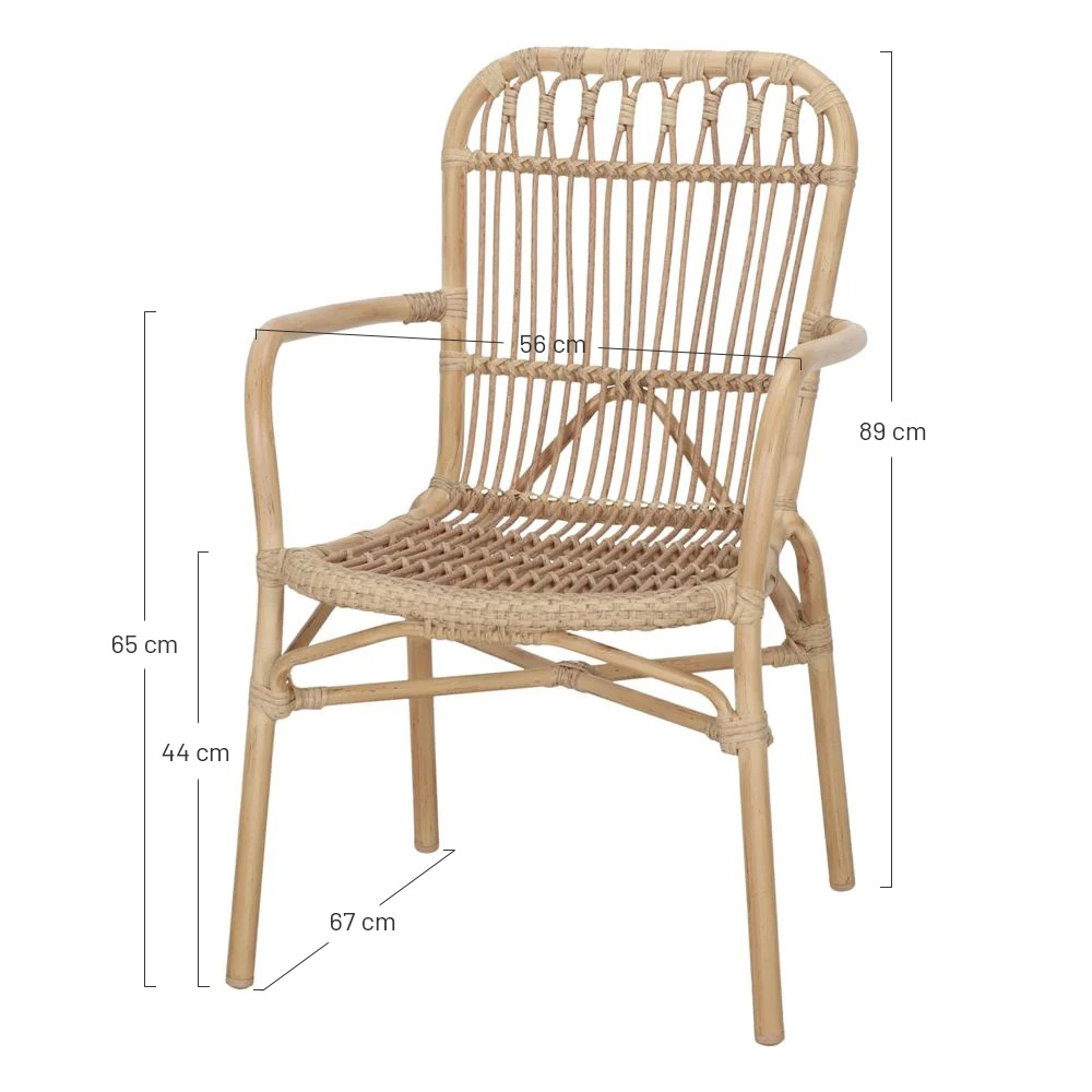 Os detalhes em rattan sintético reforçam o seu carácter mediterrânico, acrescentando textura e personalidade ao conjunto. Este material, além de ser visualmente atraente, é altamente resistente à humidade, aos raios UV e às variações climatéricas, o que torna a poltrona de exterior Paxton uma opção adequada para utilização no exterior durante todo o ano.