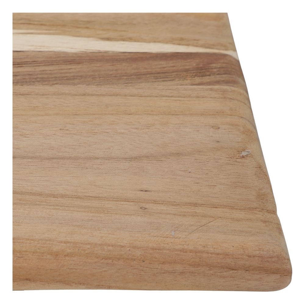 O seu design com cantos arredondados proporciona uma suavidade e elegância extra, evitando linhas rígidas e reforçando a sensação de conforto. O acabamento natural realça o grão e as tonalidades da madeira de teca, uma das mais apreciadas pela sua resistência e pela riqueza visual que confere a qualquer ambiente.